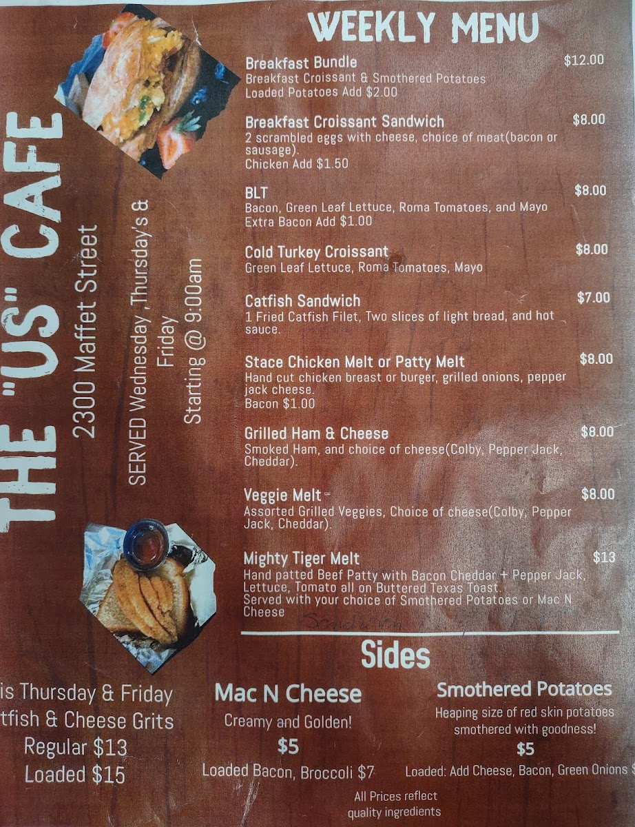 At The Us Cafe, the menu features an enticing selection sure to satisfy any palate. Start your day with their Breakfast Bundle or indulge in a savory Breakfast Croissant Sandwich that is both flaky and flavorful. For lunch, you can't miss their popular Catfish Sandwich or the Stace Chicken Melt, which deliver a symphony of tastes with each bite. Vegetarians will delight in the Veggie Melt, paired beautifully with their smothered potatoes that customers rave about for their perfectly seasoned flavor and comforting texture.